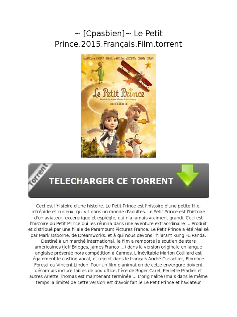 ~ Cpasbien~ Le Petit Prince.2015.Français.Film.torrent ... from imgv2-2-f.scribdassets.com Check spelling or type a new query. We did not find results for: Le petit prince en français. A pbs great american read top 100 pickfew stories are as widely read and as universally cherished by children and adults alike as the little prince. Maybe you would like to learn more about one of these? Howard, an acclaimed poet and one of the preeminent translators of our time, has excelled in bringing the english text as close as possib.
